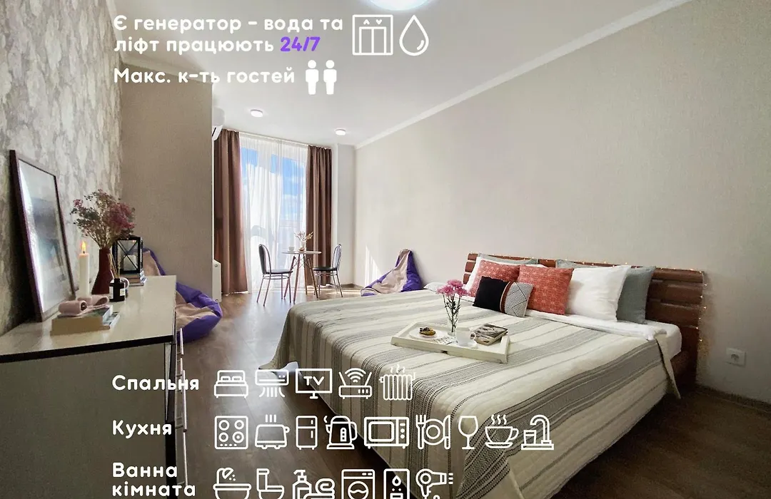 An equipped kitchen with an electric kettle, a toaster, and kitchenware is available as part of the property's self-catering amenities. Kyiv Central train station is approximately a 20-minute drive away, and Near Lotok bus stop is right around the corner from Сонячна 1-Кімнатна Квартира На Драгоманова 2-Б apartment.